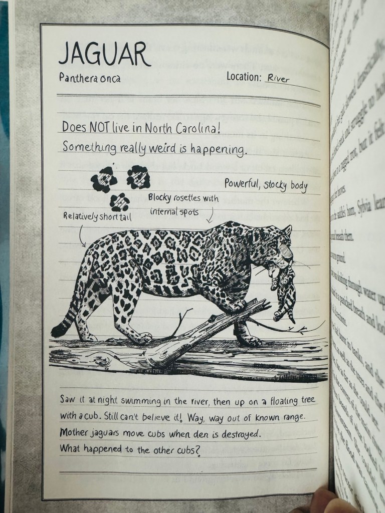 There is a lot going on there and it was more complex and intriguing than I had anticipated. This flood brings strange sightings of extinct animals and opens endless possibilities. There is an ecological message woven in there, or more aptly, a call to learn about, love and take care of the places we live in. Armed with her trusted field guides, Sylvia knows a lot about the natural world and it proves an invaluable resource on her journey. She carefully identifies and sketches down the birds and other animals she encounters.